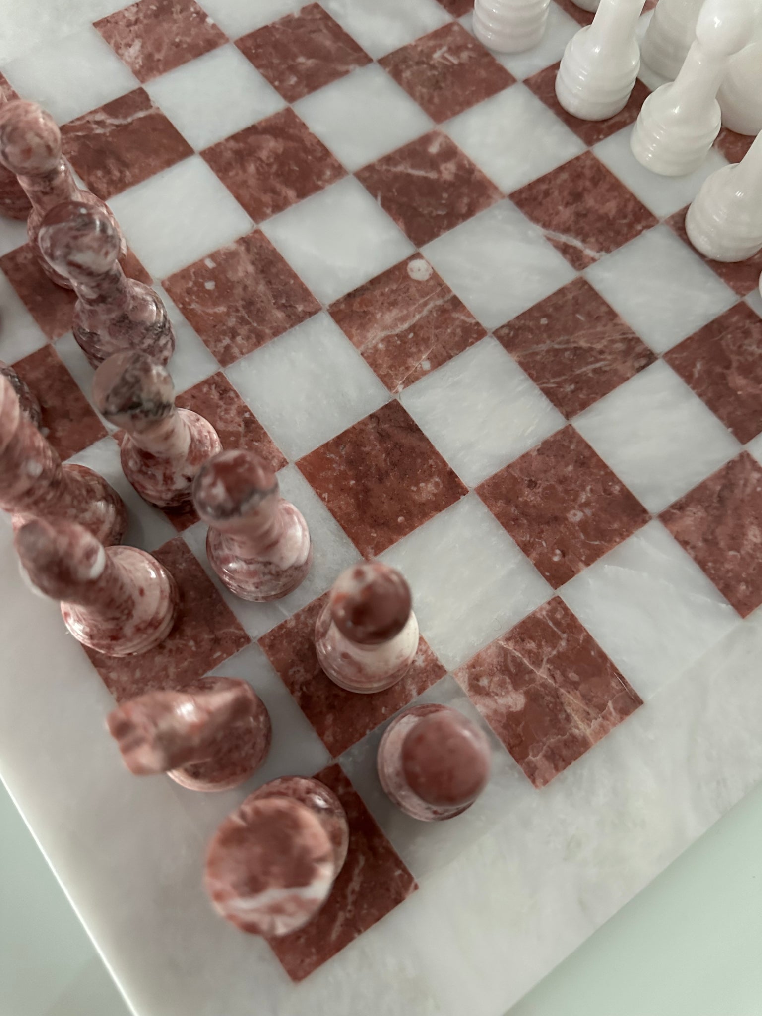 Het ontwerp valt direct op door de prachtige combinatie van wit marmer en zachte rosé onyx accenten. Dankzij de natuurlijke aders en kleurschakeringen ziet ieder bord eruit als een kunstwerk. De gepolijste afwerking geeft het geheel een luxe glans die zowel klassiek als modern oogt. Het is een set die niet alleen tijdens het spelen mooi is, maar ook als je hem simpelweg laat staan als onderdeel van je interieur.